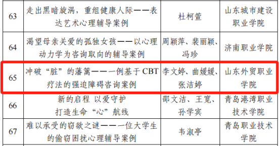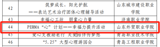 由伟德心理中心举办的“PERMA‘心’计划--幸福力提升活动”入选全省学校心理健康教育月特色活动;伟德教师李文婷、曲媛媛、张洁婷的作品《冲破“脏”的藩篱—一例基于CBT疗法的强迫障碍咨询案例》入选心理辅导干预典型案例。