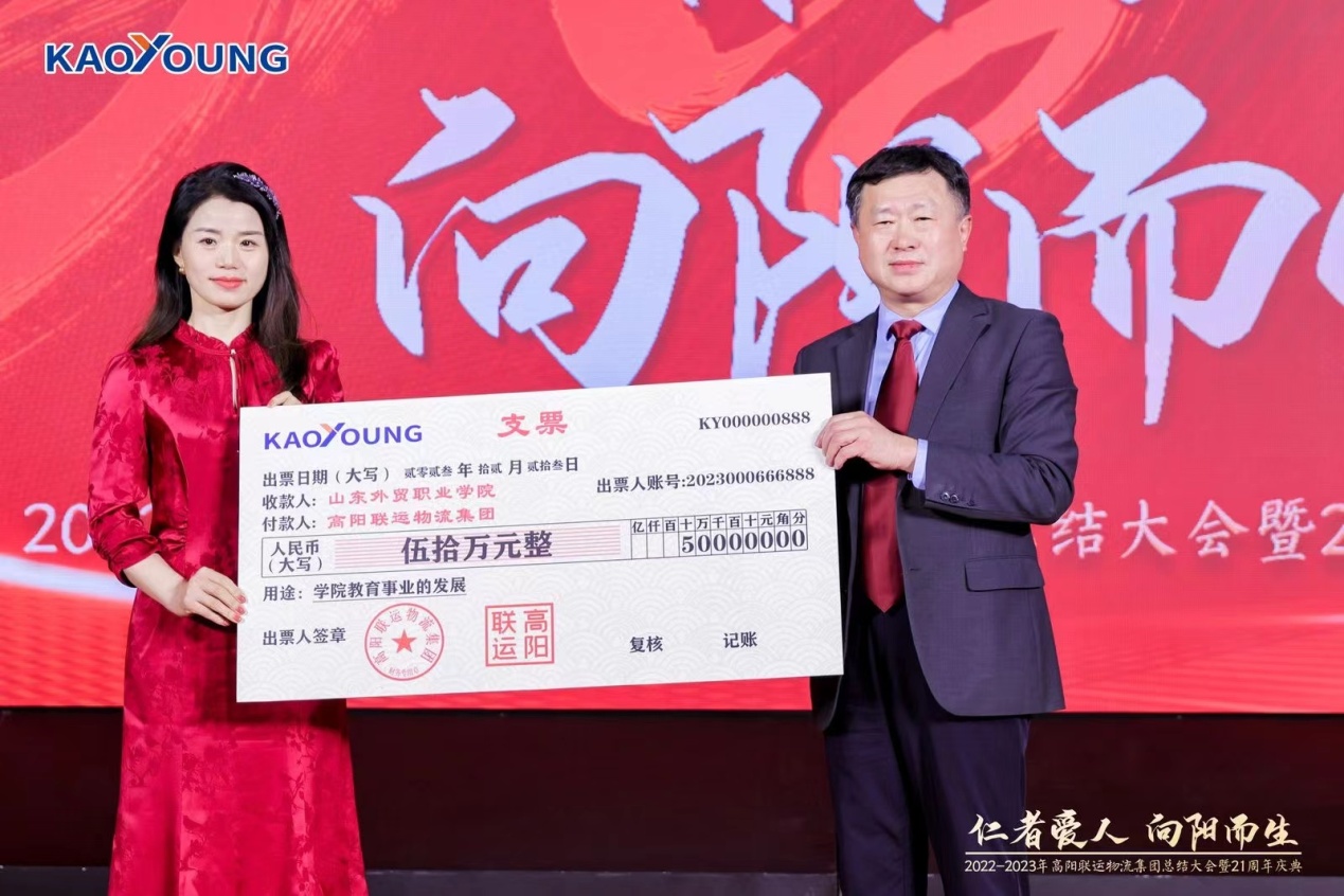 12月23日,在校友企业高阳联运物流集团21周年庆典活动中,集团董事长王爱香向学院捐资50万元,院长刁建东代表学院接受捐赠,并为其颁发捐赠证书。