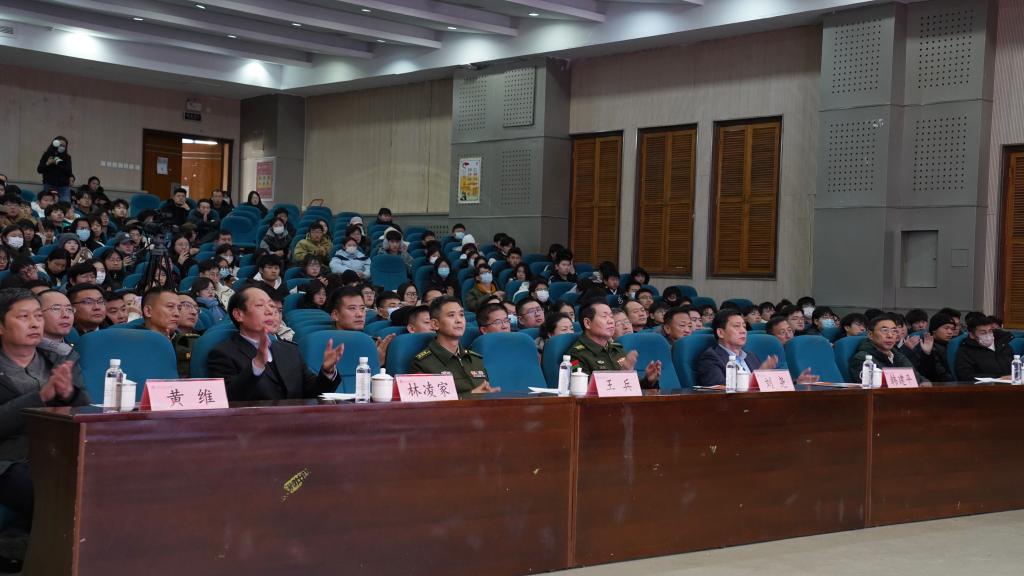 林凌家代表学院致欢迎辞,他向来宾介绍了学院的基本情况及学生应征入伍工作的开展情况。学院党委始终以习近平强军思想为指引,将国防教育和大学生征兵工作作为一项重要的政治任务抓紧抓实。打造集军训、军事理论课、民兵训练、国旗护卫队、红色主题教育、校园国防文化活动等一体化的国防教育体系;通过征兵讲座、优秀退役大学生分享交流会等方式,积极开展征兵宣传,学生参军热情空前高涨,每年有近百名大学生参军入伍,超额完成年度征兵任务。他希望同学们积极响应祖国和人民的号召,带着知识、带着文化、带着理想抱负、带着新时代青年一代的光荣使命,携笔从戎,在绿色军营这个大舞台建功立业、报效祖国,在强军梦的征程上,留下光荣的足迹。最后,他提出3点倡议:一是践行立德树人使命,主动承担征兵义务。二是支持国防建设,鼓励大学生参军报国。三是强化责任担当,当好坚强后盾。