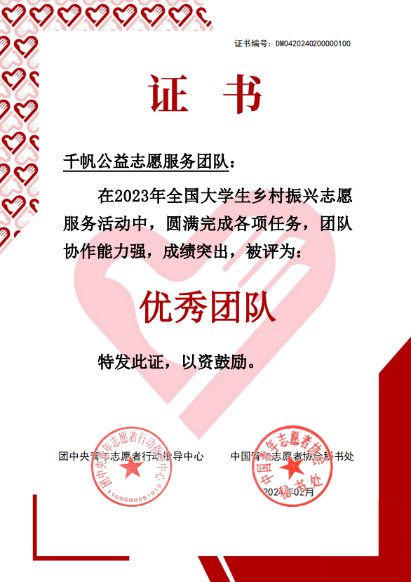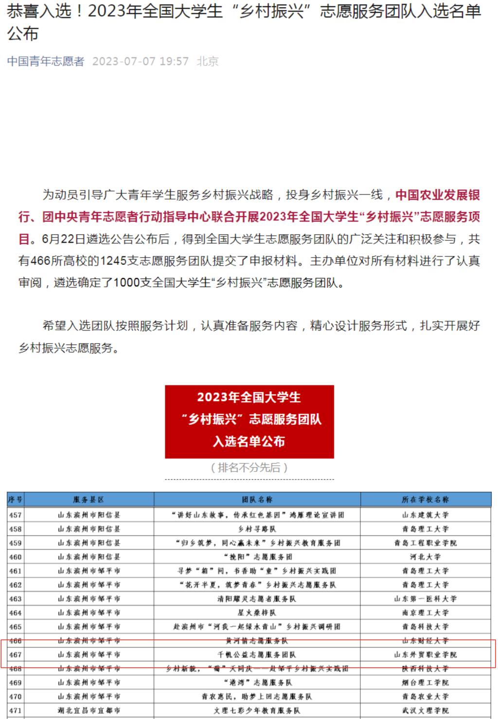 近日,由团中央青年志愿者行动指导中心和中国农业发展银行主办的2023年全国大学生“乡村振兴”志愿服务项目发布了全国优秀团队评选结果,经主办单位考核评估,伟德“千帆公益”志愿服务团队获评全国100支优秀团队之一,教师王思文、于红俊、陈磊获评优秀指导教师,辛雨遥、张蕾、李开迪、吕佳敏、刘春霖、刘春德等10名团队成员获评优秀个人。
