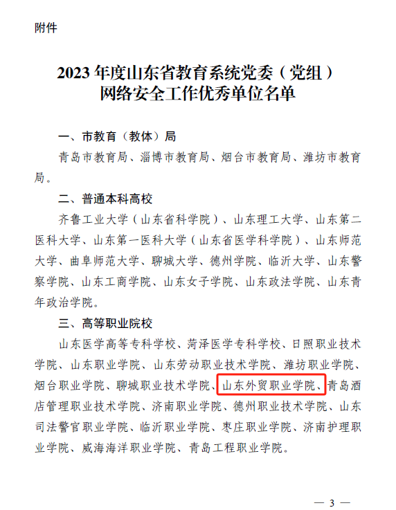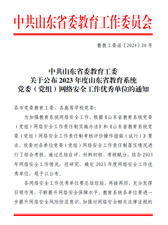 近日,中共山东省委教育工委印发《关于公布 2023年度山东省教育系统党委(党组)网络安全工作优秀单位的通知》(鲁教工委函〔2024〕20号),伟德连续三年获评山东省教育系统党委(党组)网络安全工作优秀单位。