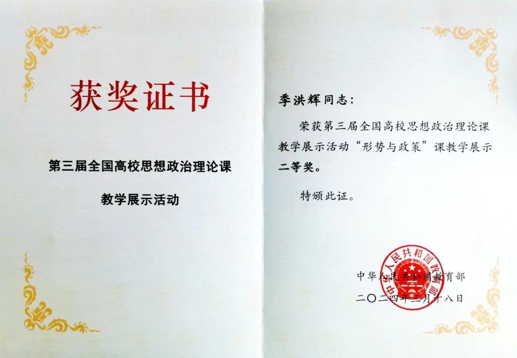 近日,教育部下发了《关于公布第三届全国高校思想政治理论课教学展示活动评选结果的通知》,伟德马克思主义学院院长季洪辉经过省级选拔推荐、全国专家网评、全国现场展示三个阶段的激烈角逐,荣获二等奖,实现了学院思政课国家级教学竞赛成绩的新突破。