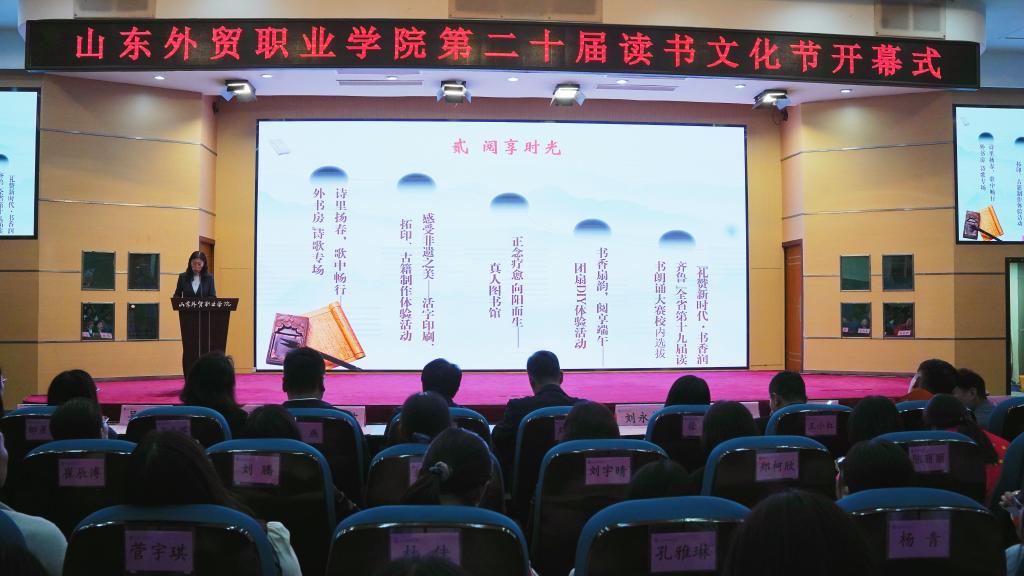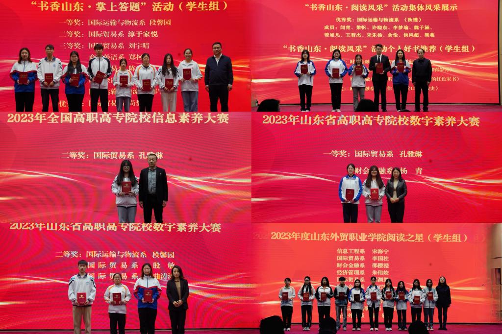 开幕式上还同时举行了2023年山东省高校师生“阅读新时代·书香润校园”阅读活动、2023年全国及山东省高职高专院校信息素养大赛、2023年伟德国际victor1946官网“阅读之星”等活动颁奖仪式,对伟德在“阅读新时代·书香润校园”活动中的获奖作品《青春万岁》和《习近平的七年知青岁月》进行了现场展示,财会金融系吕思衡同学现场表演了诗歌朗诵《祖国,或以梦为马》。