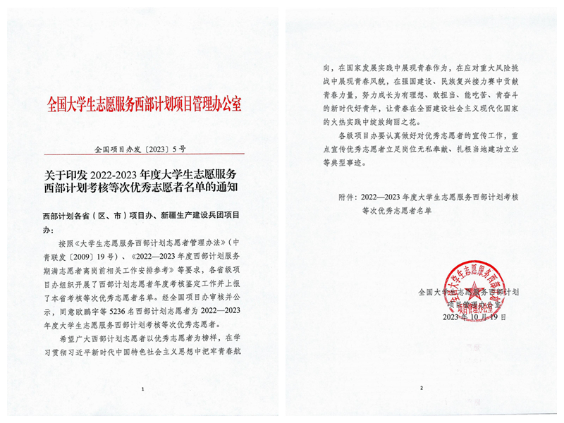 近日,全国大学生志愿者服务西部计划项目管理办公室印发了《关于印发2022-2023年度大学生志愿者服务西部计划考核等次优秀志愿者名单的通知》(全国项目办发〔2023〕5号),伟德2021届西部计划志愿者王雨欣,2022届西部计划志愿者马柯、孙红敏获评全国2022-2023年度大学生志愿服务西部计划优秀志愿者,也是伟德学子近年来首次获得此项荣誉!