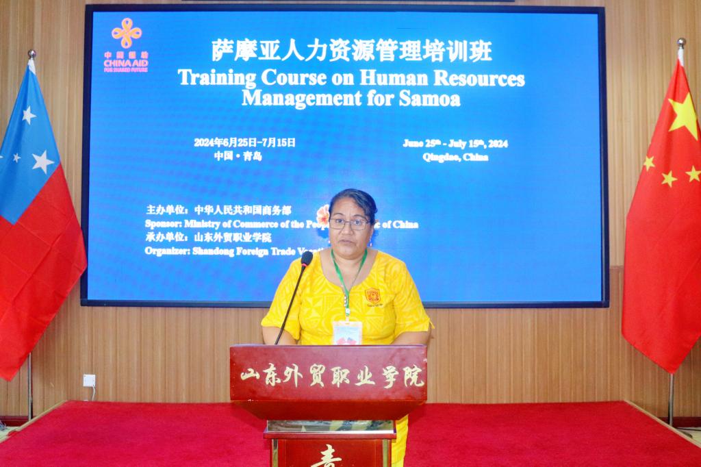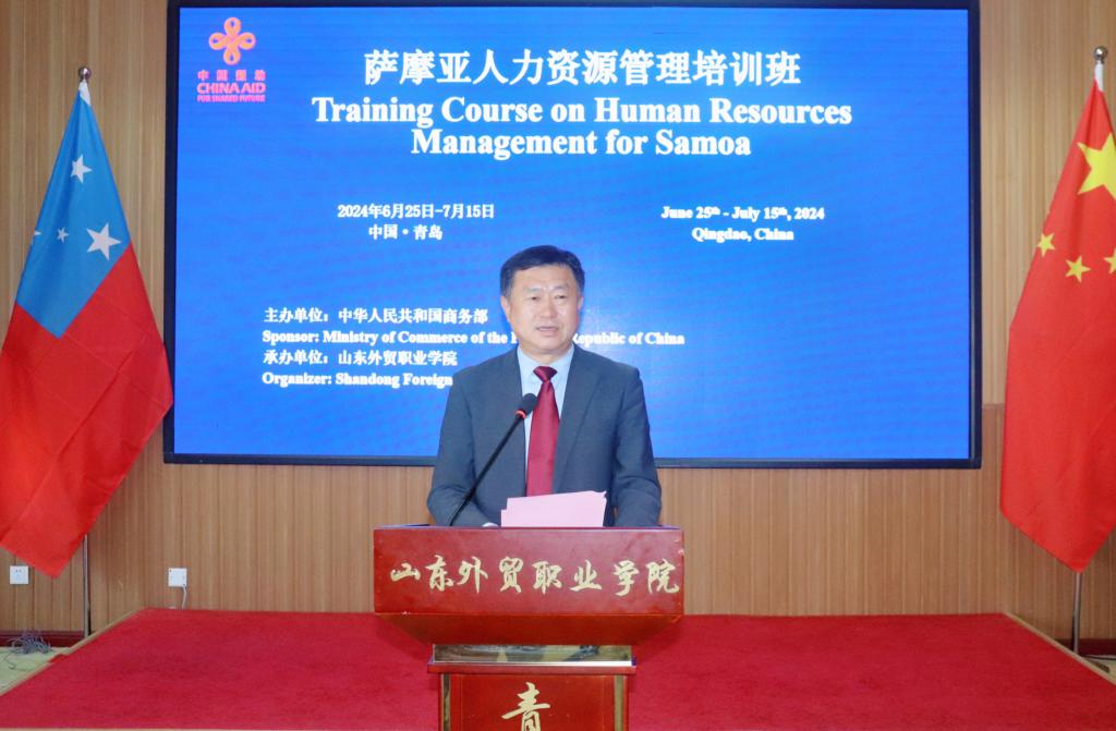 刁建东在致辞中概述了中国人力资源管理的现状以及山东省、青岛市与学院的基本情况。刁建东指出,人力资源是推动经济社会发展的第一资源,人力资源服务业已成为我国现代生产性服务业中最具赋能百业的“链点”产业。他介绍了伟德在开展人力资源管理培训方面的丰富经验,回顾了伟德与萨摩亚之间的友好往来,近年来伟德已承办6期针对萨摩亚的双边培训班,涉及教育、能源、制造业、人力资源管理等多个领域,培训学员200余人,萨摩亚驻华大使还曾于2018年专程赴青岛参加萨摩亚烹饪技术培训班的结业典礼。他希望此次培训能给学员们的工作带来启发,进一步促进中萨两国在教育、经贸、人力资源管理等方面的交流与合作。