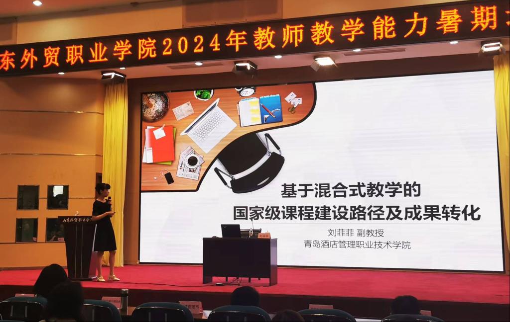 刘菲菲副教授作了《基于混合式教学的国家级课程建设路径及成果转化》的报告。从数字化转型的内涵、课程建设步骤、线上教学对教师的新要求到课程层面的“三教”改革做了详细讲解,阐明了教师数字化素养和核心能力的发展方向,分享了《酒店物品艺术赏析》国家精品在线开放课程的建设经验,展示了教师教学能力提升的经典案例。
