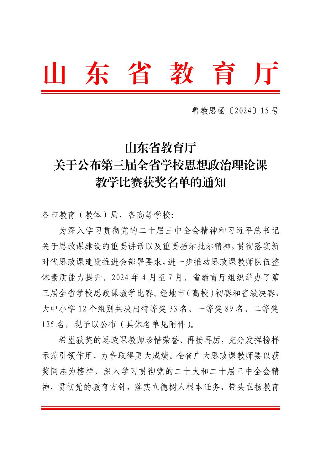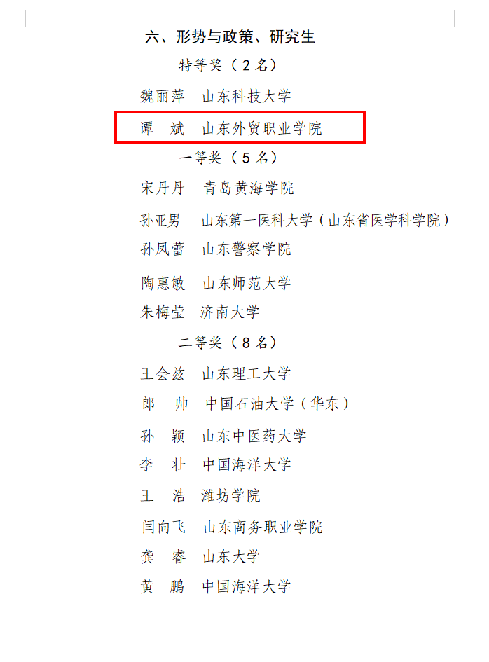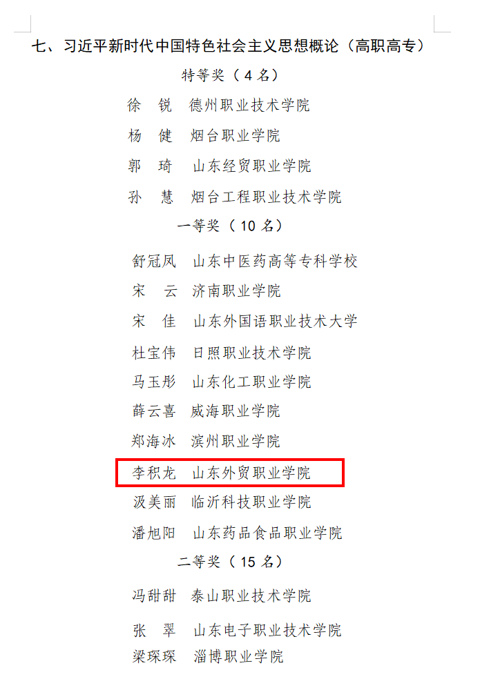 近日,山东省教育厅公布第三届全省学校思想政治理论课教学比赛获奖名单,伟德马克思主义学院教师谭斌获得本科和高职“形势与政策”组特等奖、李积龙获得高职高专“习近平新时代中国特色社会主义思想概论”组一等奖,获奖数量和等次在全省高职院校中名列前茅,实现了学院思政课省级教学竞赛成绩的新突破。