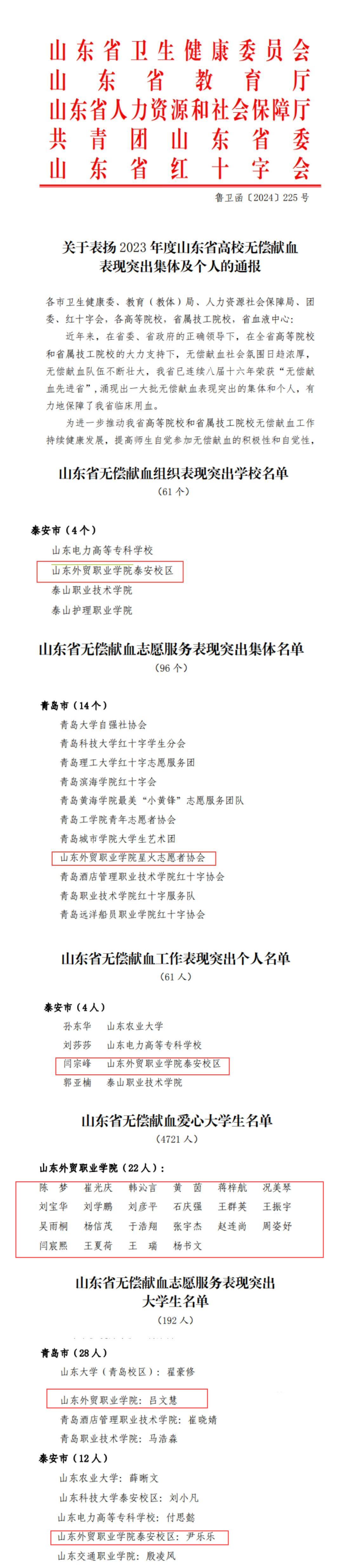 近日,由山东省卫生健康委员会、山东省教育厅、共青团山东省委等部门联合发布的《关于表扬2023年度山东省高校无偿献血表现突出集体及个人的通报》,对一批在积极参与无偿献血工作中表现突出的集体、个人和大学生进行了通报表扬。