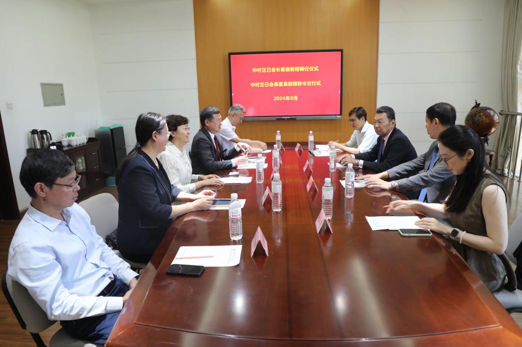 中村正己一行参观了学院校友风采展,与学院领导就培训合作、学生海外实习就业、专业建设、中日企业经贸合作等方面进行了深入交流。学院聘请中村正己为学院客座教授,刘珉代表学院向中村正己颁发了聘书。