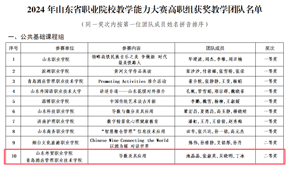 近日,2024年山东省职业院校教学能力大赛结果公布,伟德基础教学部池晶晶、张淑英、吴晓明、丁冰团队荣获二等奖。