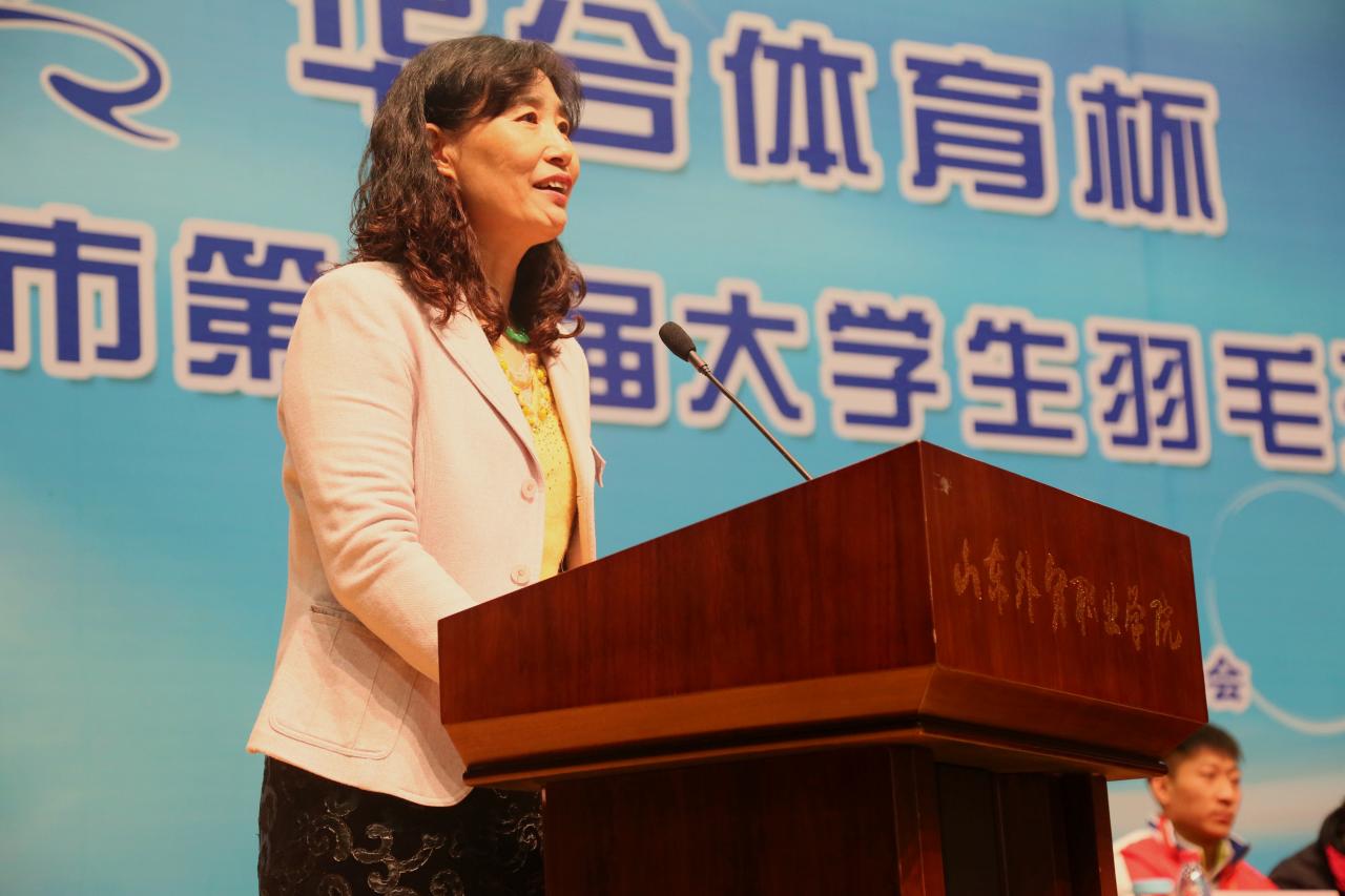 贺秋花在致辞中首先代表山东华兮体育设施有限公司向大会开幕表示热烈祝贺。她表示,该项赛事非常有意义,希望更多的同学参与到羽毛球运动中来。她希望参赛队员在比赛中保持昂扬斗志,取得优异成绩。