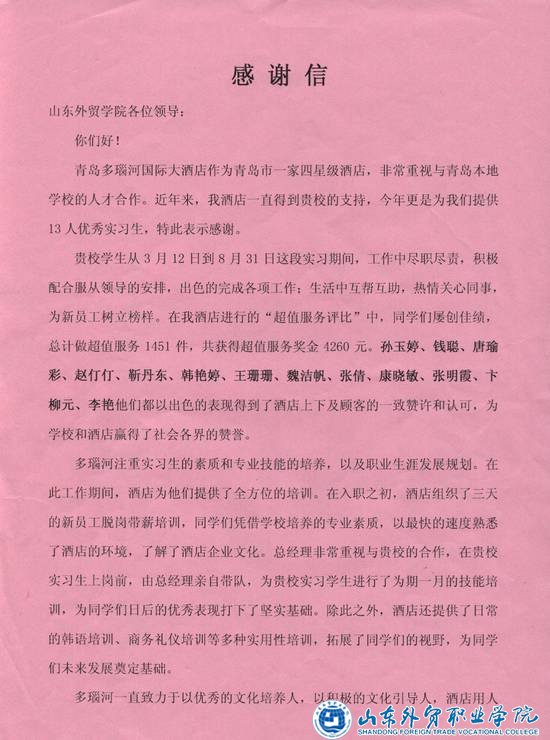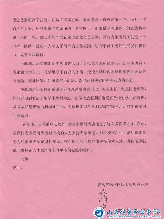 纪总经理高度赞扬了在多瑙河国际大酒店实习的伟德历届旅游专业学生。他说,实习学生爱岗敬业,专业素质过硬,能在极短的时间内适应环境,而且在各自岗位上获得乐酒店同事和顾客的认可。他向伟德长期为多瑙河国际大酒店输送优秀人才表示感谢,并希望与伟德继续加强合作,为伟德学生提供好的工作机会和岗位。王院长对青岛多瑙河国际大酒店长期对伟德教育教学的支持和对学生成长的付出表示感谢,他希望双方进一步合作,为提高学生的就业竞争力,实现校企双赢不断努力。
