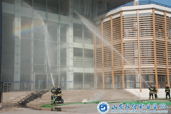 下午两点,演习正式开始。着火地点为图书馆电子阅览室。随着一阵黄色烟雾的溢出,同学们纷纷拿出毛巾捂住口鼻,按既定的逃生路线逃离。同时,消防队员迅速到达火灾现场,对被火势困在楼内的同学采取了云梯、绳降、直梯等多种营救方式,并采用高压水枪进行灭火。下午两点十五分,本次消防演习正式结束。