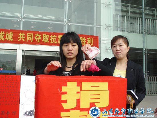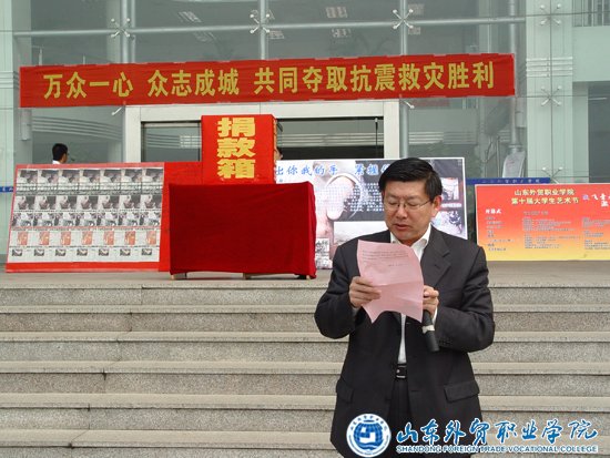 5月12日,四川汶川地区发生7.8级强烈地震,灾情牵动着学院每位教职员工的心,院党委高度重视,5月14日下午召开中层干部紧急会议。会上,党委书记李良斋传达了省外经贸厅党组、省委高校工委和青岛市委的文件精神,介绍了全市目前总体捐助的情况,号召全院教职工紧急行动起来,各尽所能,捐款捐物,支援灾区抗震救灾工作。