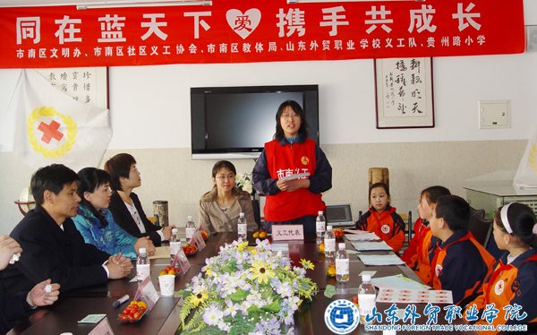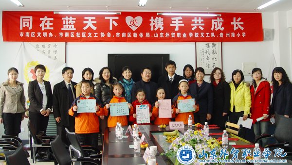 3月5日院党委副书记魏长征、商务外语系党总支书记杨岚、团委副书记李欣、院学生会干部朱青及院市南义工队代表夏瑜到贵州路小学参加了“同在蓝天下,携手共成长”爱心捐助仪式。