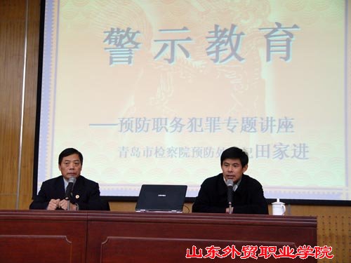为促进学院党风廉政建设,预防职务犯罪,1月11日下午,学院纪委邀请了青岛市检察院预防职务犯罪处田家进书记来伟德作了以预防职务犯罪为内容的警示教育讲座。党委副书记、纪委书记魏长征同志主持会议,院领导、中层干部和分管人财物部门的工作人员参加了讲座。