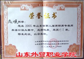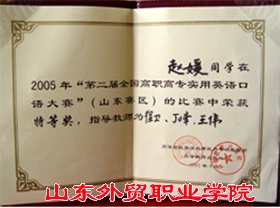 本届大赛由省教育厅高教处,高等教育出版社及山东省大学外语教学研究会主办,山东交通学院承办,全省39所高职院校参赛,与首届大赛相比影响更广泛,竞争力更激烈。赵媛同学以充足的自信、大方的仪态、清晰的发音、流利地表达,征服了在场的评委和观众,从众多选手中脱颖而出,获得特等奖,将于11月中旬代表山东省赴北京参加全国高职高专实用英语口语大赛的决赛。
