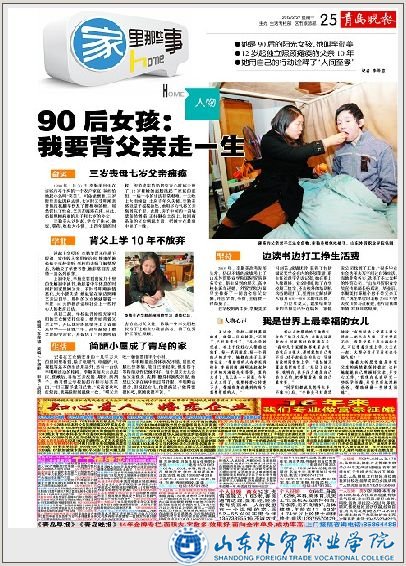 2月25日,在辅导老师崔洪宇的陪同下,青岛晚报记者李泽慧对伟德国际贸易系2009级国际贸易实务三班学生李勤美进行了面对面的采访。2月27日,《青岛晚报》25版整版以《90后女孩:我要背父亲走一生》为题,对李勤美的事迹进行了深入报道。