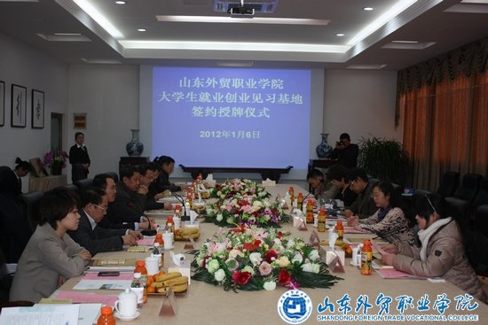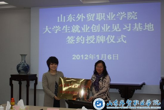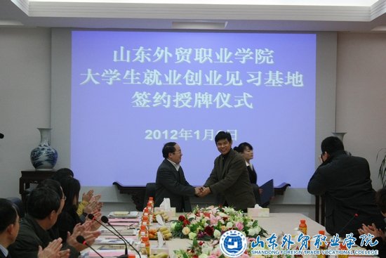 仪式上,党委副书记魏长征代表学院与四家企业签订了建立“大学生就业创业见习基地”合同。魏书记为青岛亨达股份有限公司和青岛妙府老酒有限公司授牌,程巍部长为青岛琴岛电器有限公司授牌,李欣书记为青岛红妮集团服饰有限公司授牌。