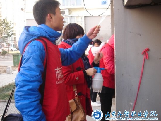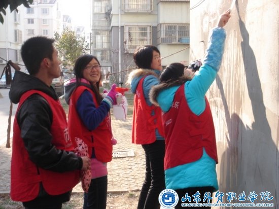 12月10日上午,商务外语系市南义工队组织2011级志愿者来到李沧区虎山街道办事处附近,为周边社区清除贴在墙上的小广告,活动赢得了周围居民的一致好评。