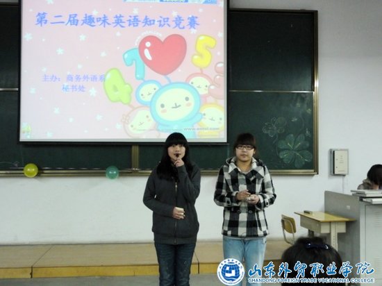 比赛分为猜谚语、单词接龙、知识竞答、精彩互动等环节。猜谚语环节要求参赛同学在三十秒内答出三个有相对难度的英语谚语选择题,不仅考察了同学们的英语水平,更考验了参赛同学的反应灵敏程度以及良好的心态。各队选手都屏住呼吸看着题板,当题目做完后大家都松了一口气。单词接龙强调速度与协作,参赛选手们你来我往,现场气氛紧张而激烈。来自10商英二班的王帅同学凭借自己扎实的英语功底和稳而不慌的心态,最终在本环节中取胜,博得现场一片喝彩。随后的知识竞答环节侧重考察选手们对西方人文、地理等知识的了解。而最后的精彩互动环节更将赛场的气氛推向了最高潮。最后,10商英一班等三个班级凭借参赛同学的出色表现夺得总成绩一等奖,其他班级分获二三等奖。活动在一片欢声笑语中圆满落下了帷幕。