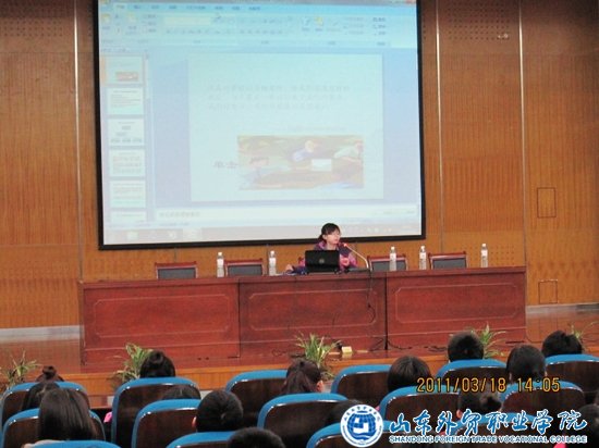 04商英四班的王婷婷同学首先登台,就货代行业的分类、工作性质、内容及具体的业务流程做了详细的介绍。她还特别提到,大小公司的需求不同,同学们在投简历时应仔细斟酌,珍惜每一次机会,学会“择其所需、择其所爱”;注意培养自己的沟通及团队协作技巧,增加知识储备,提高英语运用能力。随后,04商日一班的胡荣丽同学、05商务韩语班的史汝平同学分别结合自己的专业和工作经历向同学们做了介绍,分享了自己工作过程中的一些收获与体会,并告诫大家工作中可能会碰到许多困难和挫折,但这却是很宝贵的财富,鼓励同学们要对将来充满信心。接着,05商英二班的李可嘉同学给大家详细介绍自己由一名专科到研究生的成长经历。2010年暑假,她参加了美邦国际暑期赴美社会实践项目,她用英语讲解了她亲身体验美国生活文化、与来自其它国家的国际学生并肩工作的经历,大量翔实的图片让大家身临其境、耳目一新。
