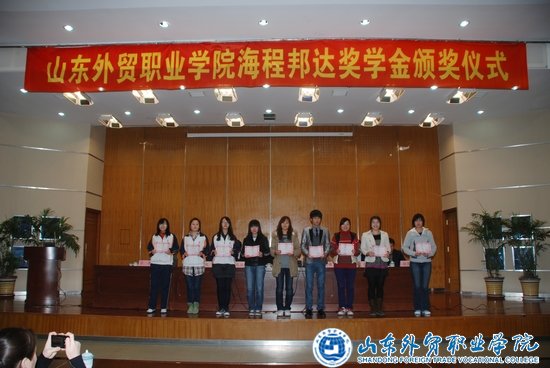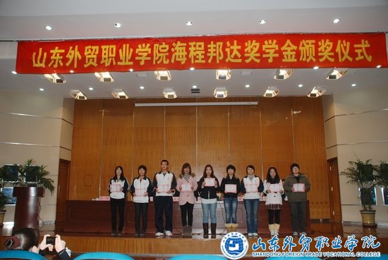 学生工作部(处)处长张风文宣读了2010年海程邦达奖学金获奖学生名单,出席颁奖仪式的领导为获奖的集体及学生代表颁发了证书。奖获集体09计算机信息管理2班代表殷文秀,获奖个人代表、综合表现优秀奖获得者、商务外语系牟琛同学分别作了发言。