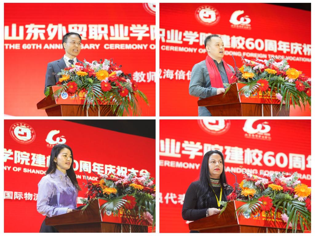 国际贸易系教师王中,威海倍佳贸易有限公司董事长伊善潍,高阳联运物流集团(青岛)有限公司董事长王爱香,苏里南教育科学文化部政策顾问拉努·拉梅瓦尔,分别代表教师、校友和援外培训学员发言。