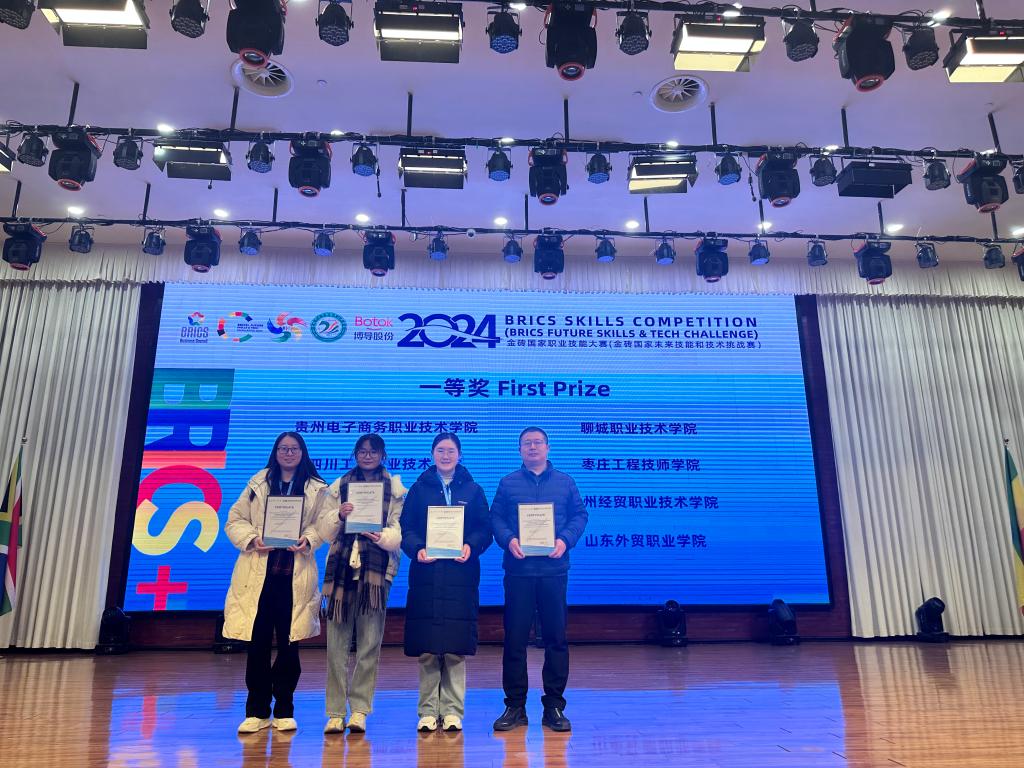 12月7日,2024年金砖国家职业技能大赛“直播电商运营”赛项国际总决赛在贵州电子商务职业技术学院顺利举行,来自全国80所院校的80支晋级队伍同台竞技,伟德跨境电子商务系徐彬、宗胜春老师指导,教师闫静雯和23级跨境电商专业学生牛焕妮、邱明玉组成的师生参赛队获得一等奖。