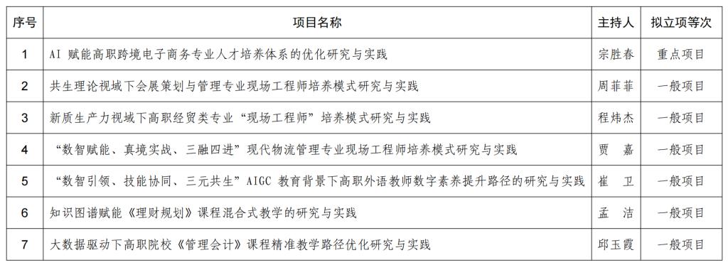 此次获批的项目研究主题聚焦人工智能、数字经济赋能教学改革等多个领域,充分体现了伟德在职业教育改革创新方面的实力和特色。下一步,伟德将以此次项目立项为契机,持续深化教育教学改革,加强项目过程管理,确保项目高质量完成。