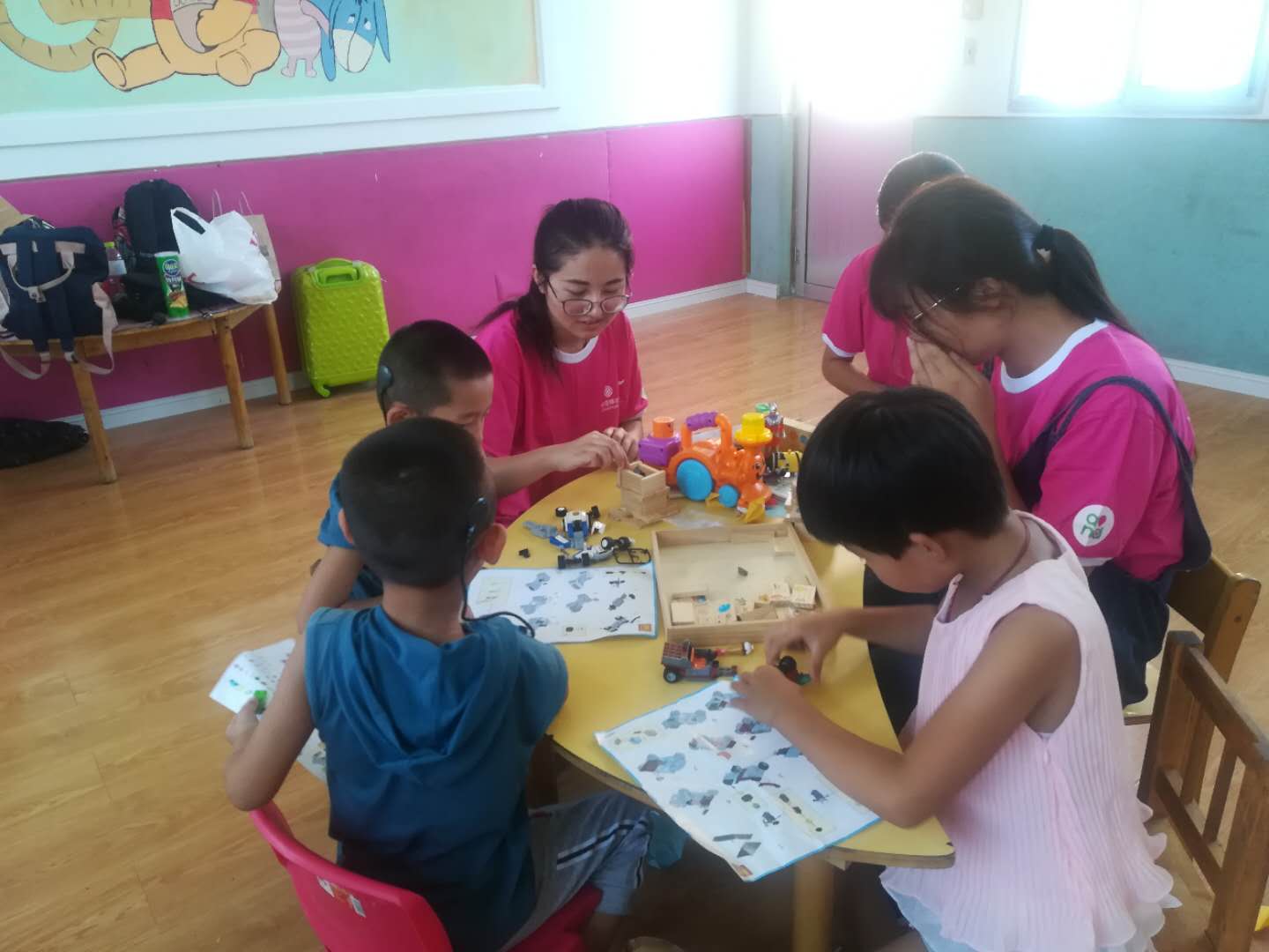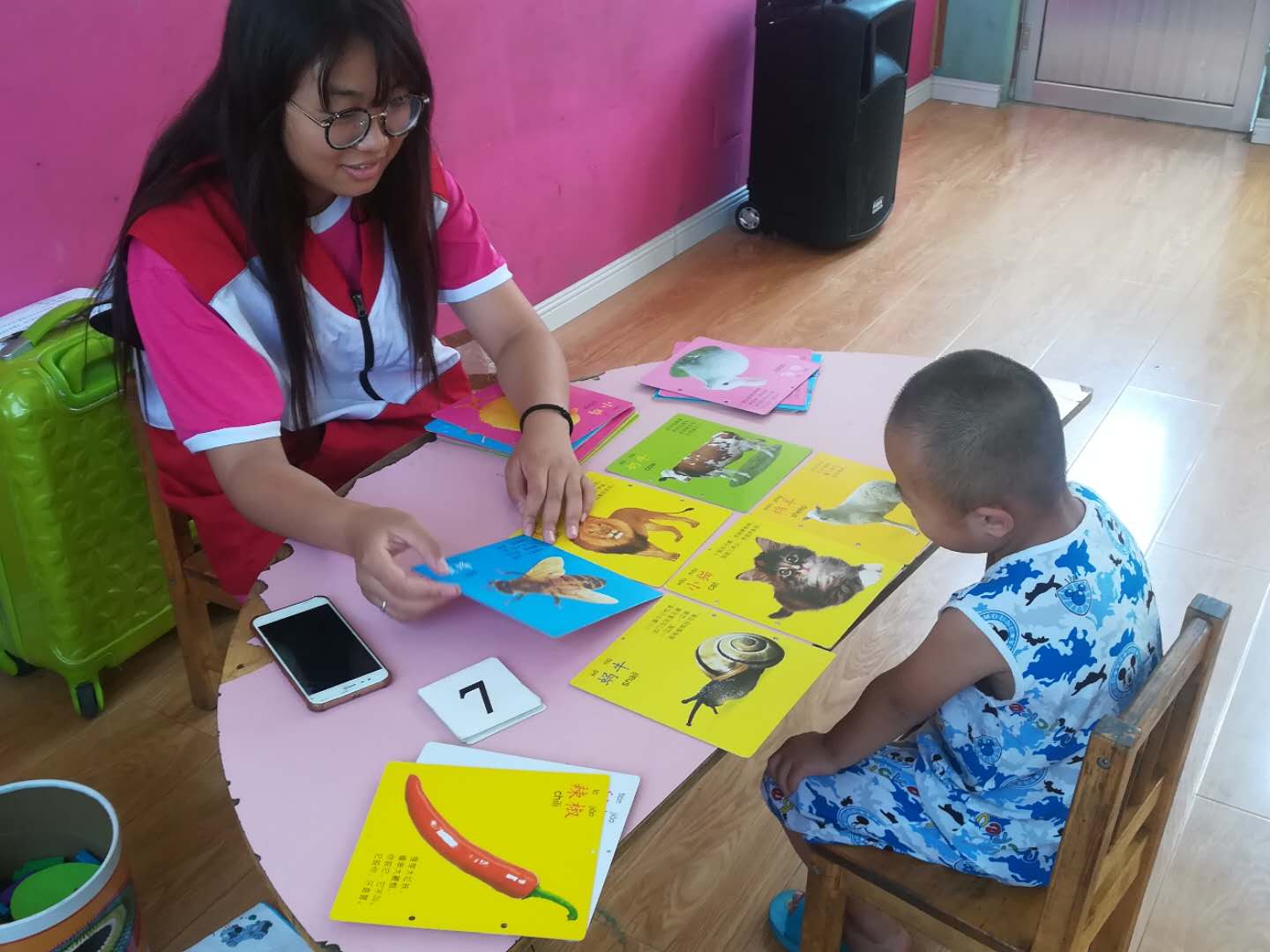 实践活动期间,星火爱心服务队的队员们与多名聋哑儿童进行了一对一的关爱教育服务。刚开始,孩子们对陌生的志愿者们不是特别的亲近,但在队员们耐心的交流和细心的照顾下,孩子们慢慢放下了戒心,愿意同队员们一起学习、玩耍。活动三天的时间里,队员们教孩子们写字、画画、折纸,陪伴孩子们做游戏,认识花草树木。与队员们熟悉起来的孩子们活泼好动,在队员们的组织下还进行了折纸比赛等群体性活动。
