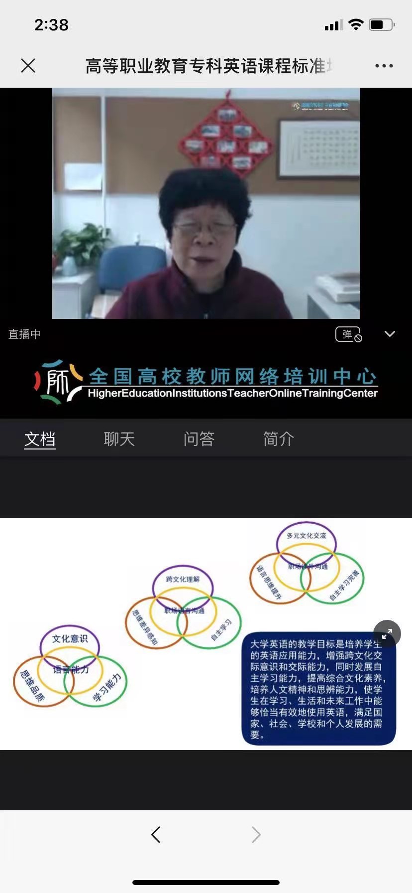 4月9日下午,公共英语部组织部分教师在线参加了由教育部职业技术教育中心研究所主办,高等教育出版社承办的高等职业教育专科英语课程标准(2021年版)培训。培训内容包括学习《国家职业教育改革实施方案》,职业教育国家教学标准体系新发展,解读高等职业教育(专科)英语课程标准等相关内容。