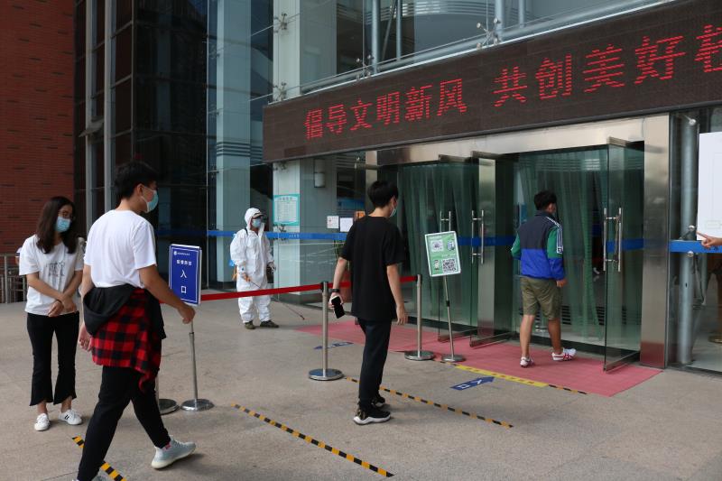 演练场景设置在图书馆大厅入口和社科二书库,馆员们分别模拟演练了读者入馆、体温检测、发现体温异常者应急处置、场馆消毒等场景。整个演练过程严格按照疫情防控应急预案进行,分工明确、协调有序,各环节密切配合,达到了预期效果。演练结束后,图书馆馆长张风文对演练活动进行总结,要求大家熟悉疫情防控流程和规范,将疫情防控列入常态化工作,做到精细化防控,增强疫情防控的责任感。