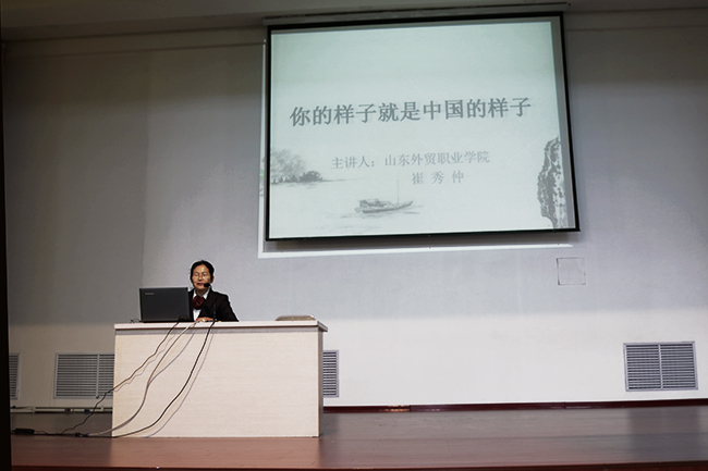 崔秀仲以《你的样子就是中国的样子》为主题,从改革开放四十年来,我国发生的翻天覆地变化谈起,列举了经济建设等领域取得的巨大成就,围绕自己在蒙古和波黑的任教经历,畅谈与外国友人相处的生活故事,描绘外国友人眼中的中国形象,从另一个侧面阐述了爱国的含义,展现了浓浓的爱国情怀和自觉维护国家形象的强烈责任感,让大家接受了一次别开生面的爱国主义教育。她还引导学生如何把爱国主义情感转化为实际行动,努力学好专业知识,做到知明而行无过,提高自身素质和综合能力,做无愧于时代的奋斗者。