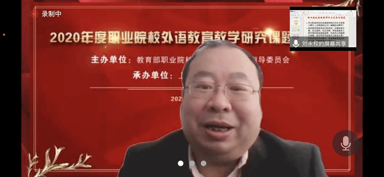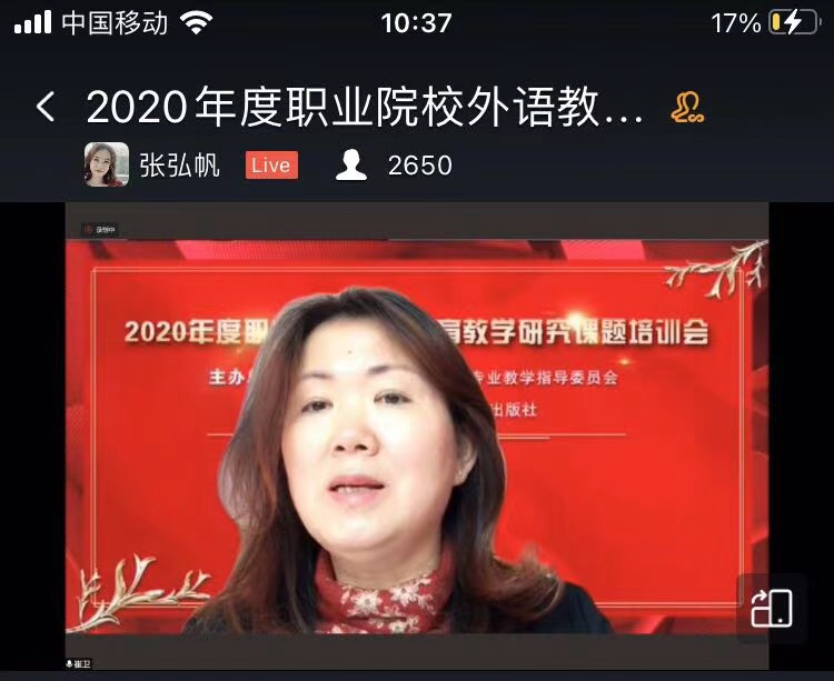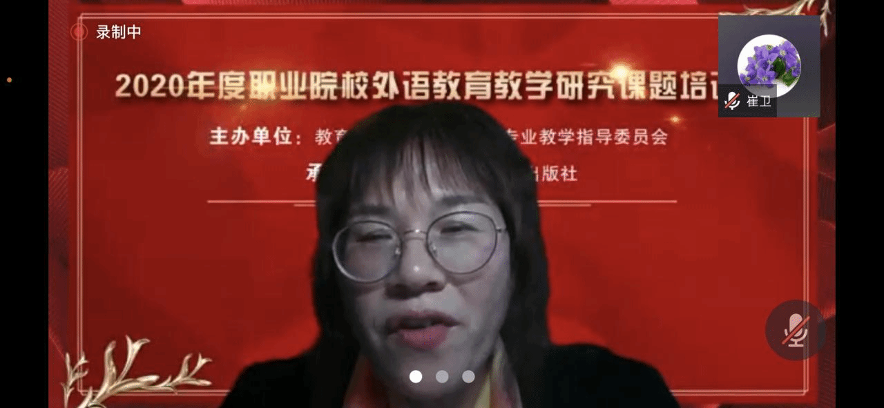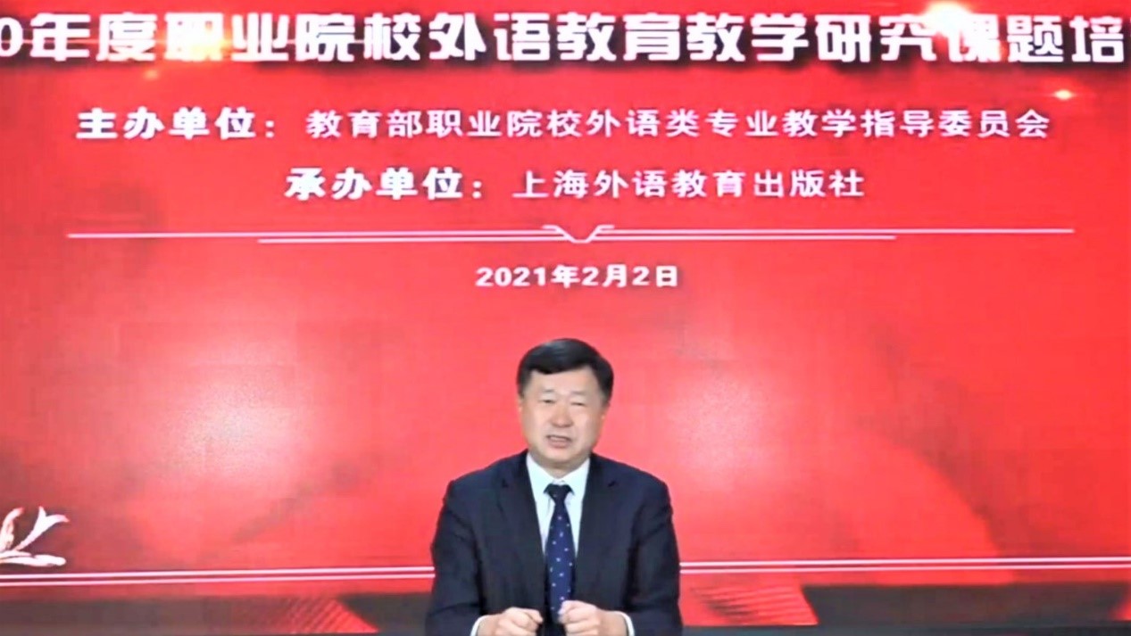 近日,公共英语部组织全体教师在线参加了2020年度职业院校外语教育教学研究课题培训会。本次培训会由教育部职业院校外语类专业教学指导委员会主办,上海外语教育出版社承办。来自全国各高校的立项课题负责人及成员、全国职业院校外语院系部负责人、外语学科带头人和骨干教师等近三千人参加了本次会议。教育部职业院校外语类专业教学指导委员会主任委员、伟德院长刁建东和上海外语教育出版社党委书记、社长、总编辑孙玉在会上致辞。教育部职业院校外语类专业教学指导委员会秘书长、伟德公共英语部主任崔卫主持了培训会。