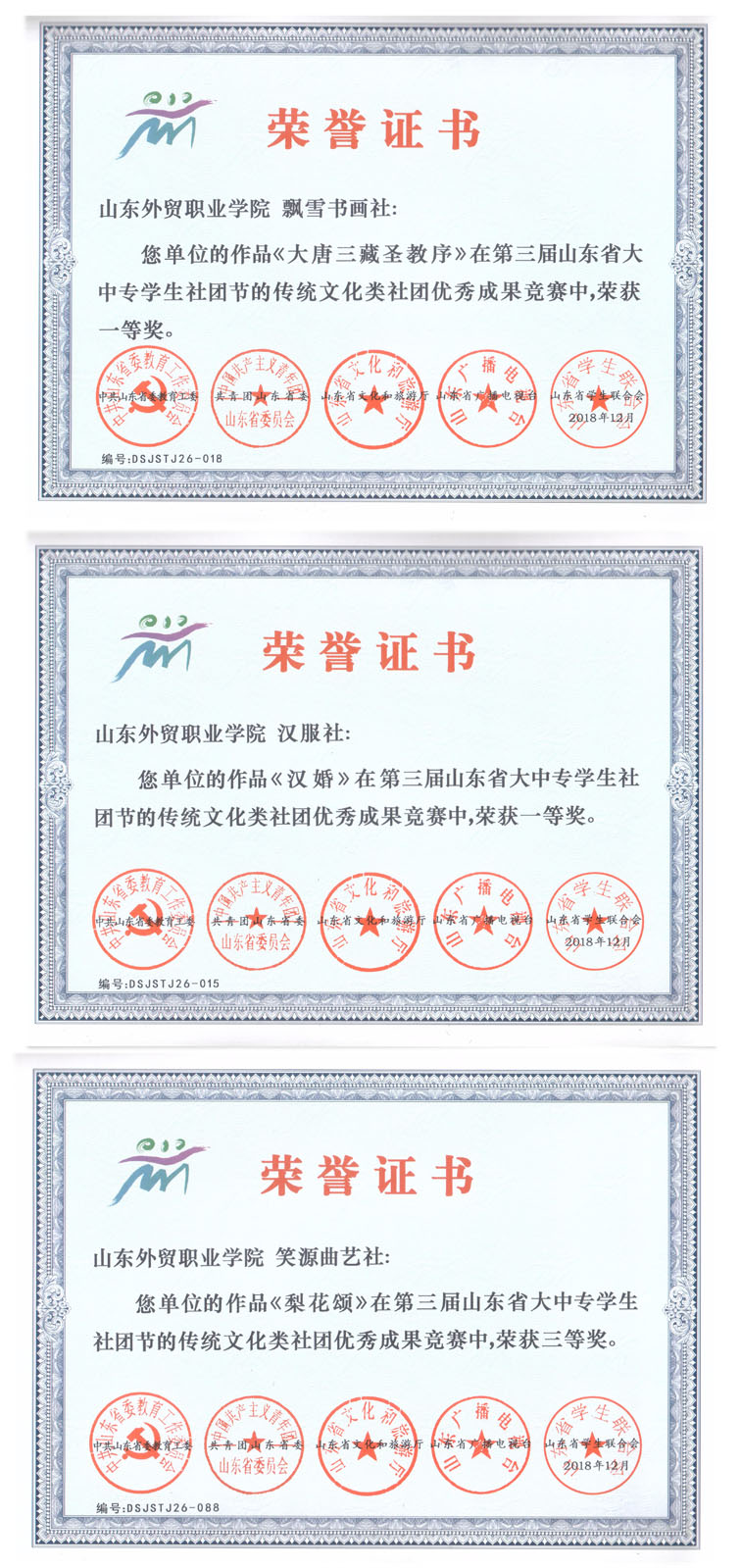日前,由中共山东省委教育工委、共青团山东省委、山东省文化厅、山东广播电视台、山东省学生联合会主办的第三届山东省大中专学生社团节“传统文化·青春梦想+”传统文化类社团优秀成果竞赛结果公布,伟德获得一等奖两项、三等奖一项。其中,飘雪书画社选送的书法作品《大唐三藏圣教序》获实物类作品一等奖,汉服社选送的传统礼仪作品《汉婚》获视频类作品一等奖,笑源曲艺社选送的传统戏曲作品《梨花颂》荣获视频类比赛三等奖,信息管理系刘杰、基础教学部孙峻旭两位老师被评为优秀指导教师。