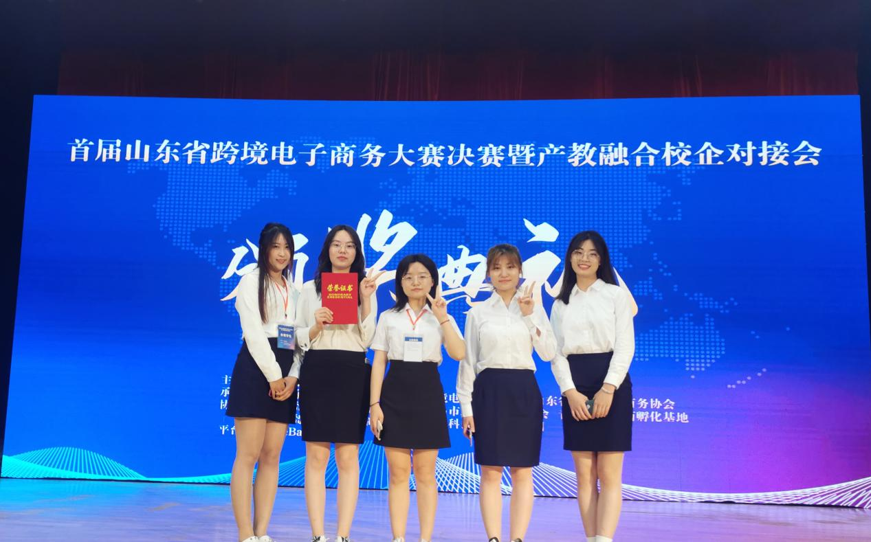在6月25日结束的首届山东省跨境电子商务大赛上,国际贸易系19国贸7班学生牛良萍、韩雨,19国贸8班学生赵璐璐,20国商3班学生焦美婷、张妮五位同学组成的团队,在教师田翠和周艾丽指导下,经过排名赛和冠军赛,以第五名的成绩获得高校赛道二等奖。
