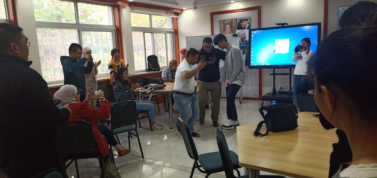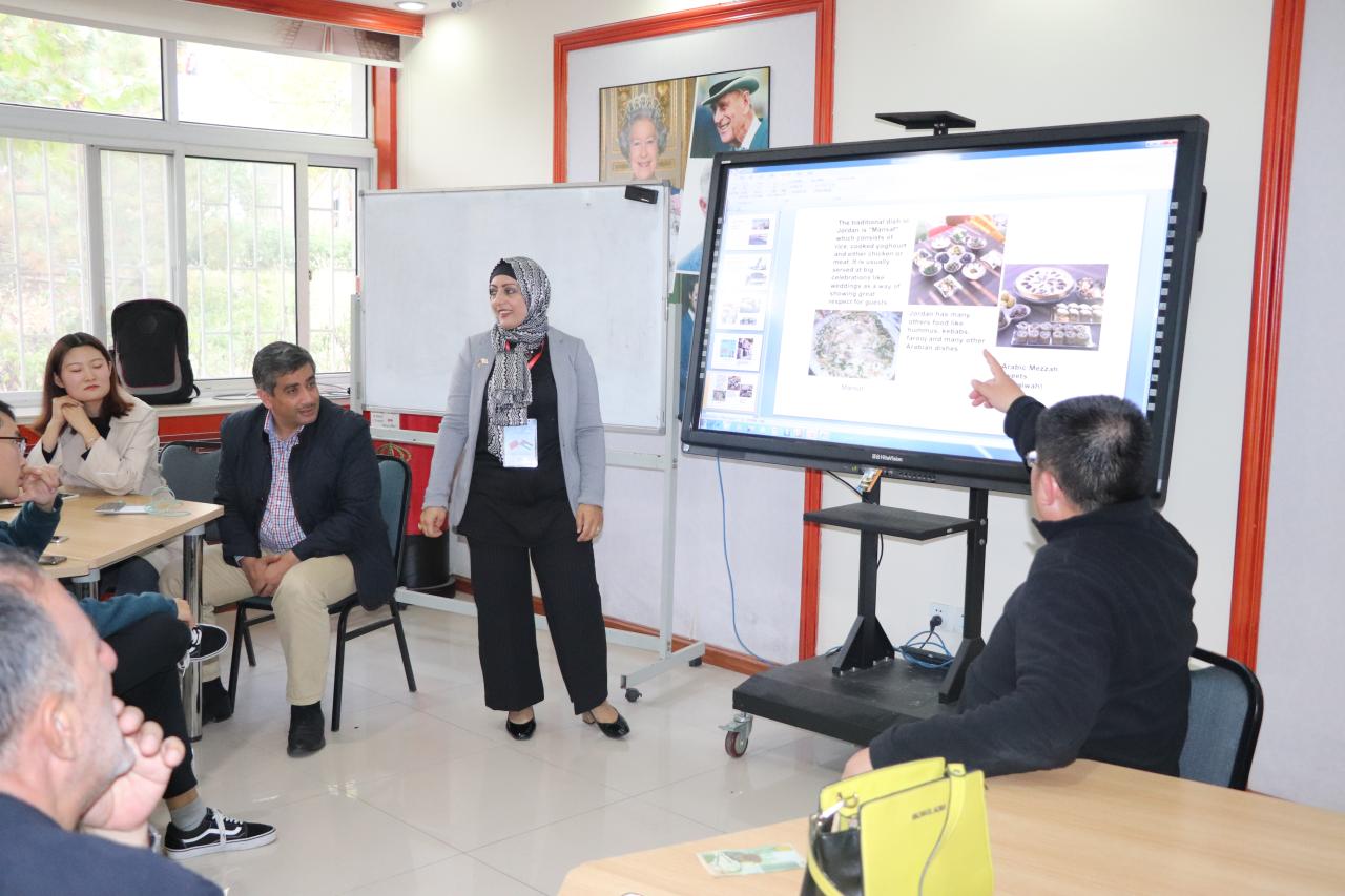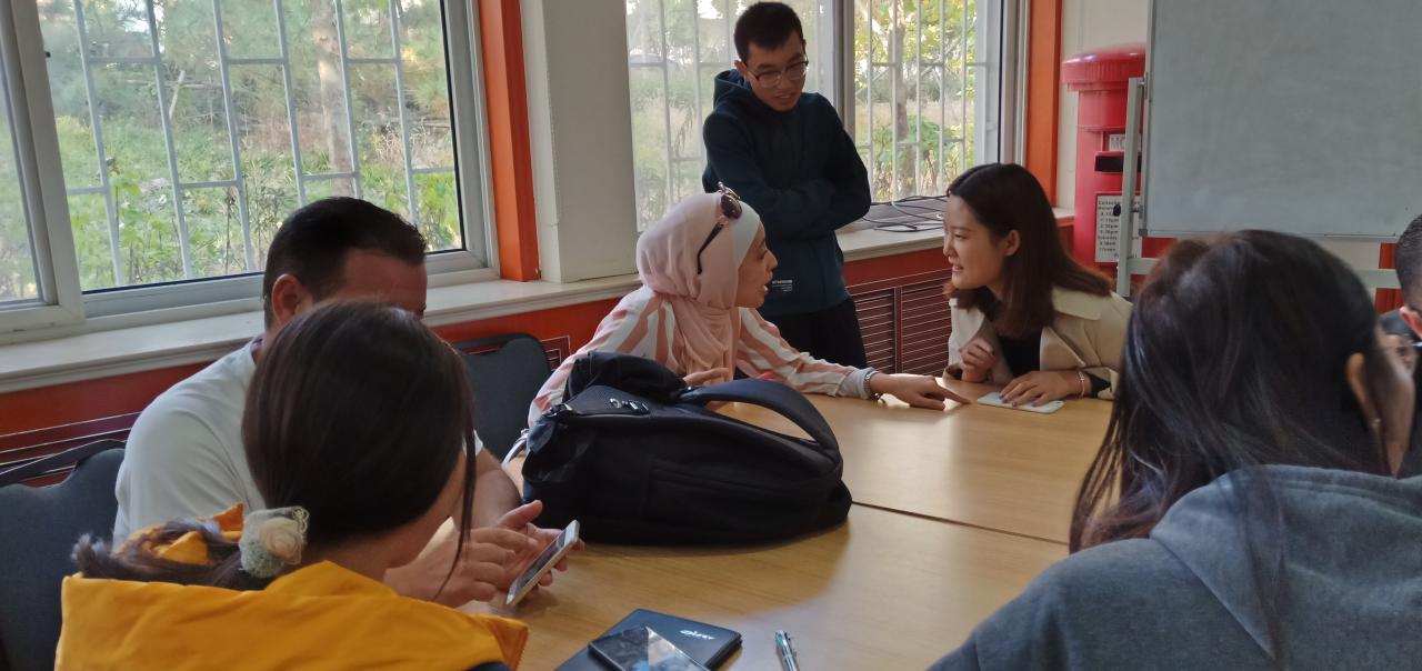 活动一开始,外国学员们就被在场同学们的热情所感染,主动坐到各小组中介绍自己。作为东道主,来自18级软件三班的苏浩田代表俱乐部向外国学员介绍了学院及俱乐部的情况。苏同学自信流利的英语表达赢得了在场外国学员们的掌声和欢呼声。随后,外国学员代表Nour做了题为“约旦Jordan”的专题讲座,带领同学们领略了约旦的文化、经济、社会等各方面,并教授了同学们一些简单的阿拉伯语。兴到浓处,外国朋友邀请在场的同学们共同跳起了当地舞蹈,为本次跨国互动画下了圆满的句号。