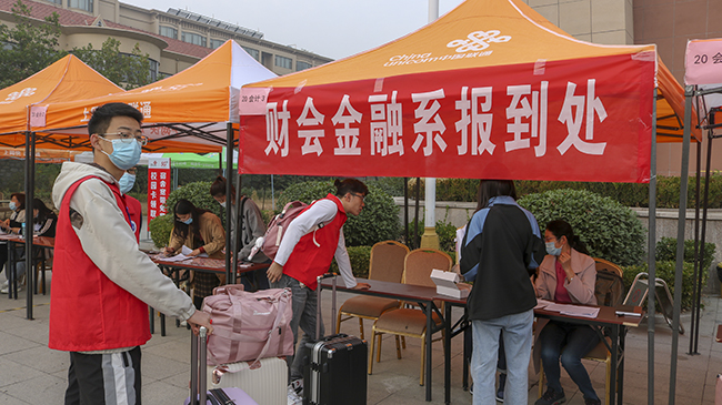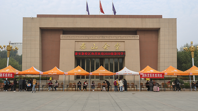 新生报到在泰山会堂前广场进行,为使新生顺利完成报到注册,沿途各环节放置了指示牌,每个环节均有志愿者热情引导,悉心服务,志愿者们在各车站点迎接新生,在校园内帮助新生搬运行李,耐心解答家长疑问,为新生及家长提供了温馨、优质的服务。