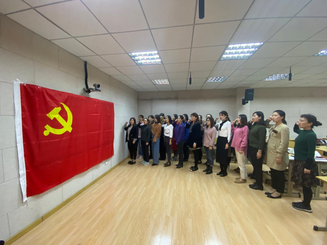 崔卫首先带领全体党员重温入党誓词。大家面对鲜艳的党旗,怀着无比崇敬的心情,庄严地举起右拳,重温铿锵的入党誓词,表达出为党的事业奋斗终生的忠心、以及作为党员教师积极响应党的号召,以坚定的理想信念、饱满的工作热情、坚强的党员意志投入到教学一线工作中的决心。