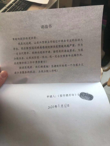 家住胶州市胶西街道办事处小行村的2018级空中乘务1班学生刘龙超同学,因看到社区里的一些居民对于疫情发展不了解,重视程度低。他作为新时代的大学生,深知此次疫情的严重性,因此志愿投身到社区防疫宣传工作的一线并写下防疫志愿书。工作中,他主要负责向社区居民发放致社区居民防范疫情的一封信,同时参与社区监测、劝返点的劝导监督工作。