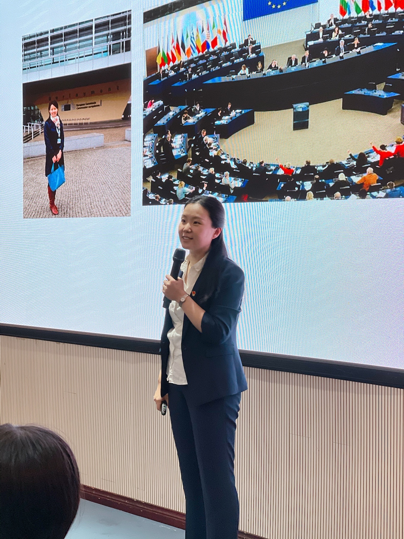 在播放了关于翻译官的视频短片之后,本期“真人图书馆”活动正式开始。刘晓兰带领大家一起观看了女翻译官张京在中美高层战略对话会上的精彩翻译片段,接着她从自己的工作和学习经历讲起,用精彩绝伦的演讲把大家带入丰富有趣的留学生活中,以图片、视频和小故事的形式给大家展示了在日本留学时的所见所闻、在欧洲各国的游学经历,以及在APEC等重大会议和外事活动上的翻译经历,同时还向同学们介绍了英语学习的技巧和方法。通过对同声传译发展历史和同声传译译员工作和职业的介绍,让读者对翻译官这一行业有了更深层次的理解。