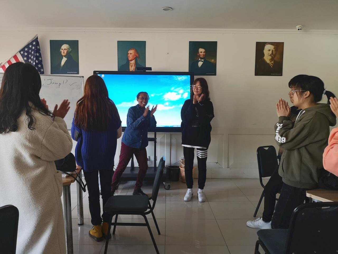 活动中,Rosalie和学生们分别从不同的角度介绍和解读了中西方节日的由来、传统以及当地的庆祝方式。Rosalie还特别邀请学生们体验了家乡英国过年时耳熟能详的民间歌曲和游戏。大家跟着她的节奏围站在教室里边拍手边唱歌,活泼欢快的曲调让在场所有人仿佛都沉浸在家人团聚的温馨气氛中。在互动游戏里,学生们还和Rosalie一起改编了美国传统歌谣《Old Macdonald》,教室里顿时充满了欢快淳朴的乡村节日气息。最后,本次英语角在Rosalie介绍关于圣诞节的传统活动中圆满结束。
