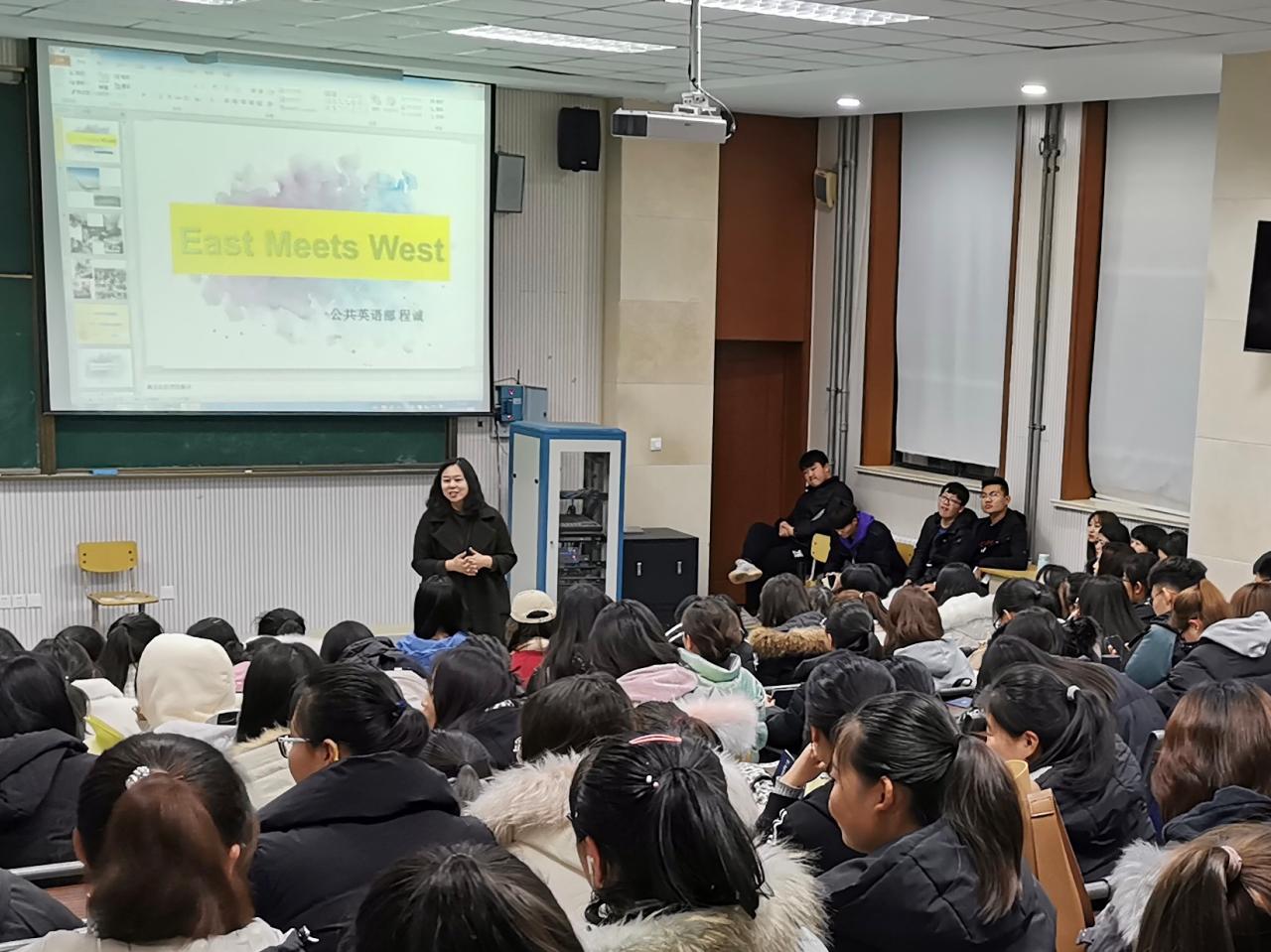 12月17日下午,公共英语部在2号教学楼B3阶梯教室举办了题为“East Meets West”的讲座。讲座由公共英语部教师程诚主讲,共有一百余名学生参加。