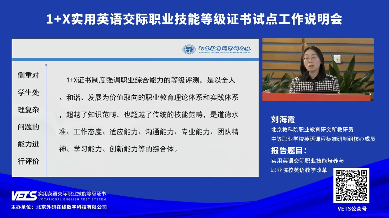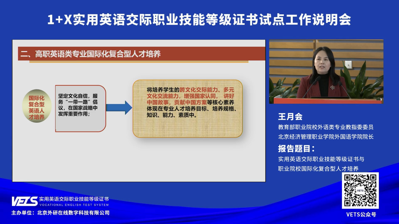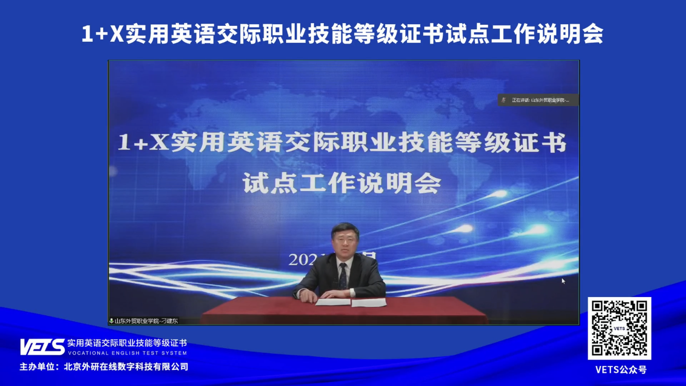 3月16日上午,1+X实用英语交际职业技能等级证书(英文名称Vocational English Test System,简称VETS)试点工作说明会在北京召开。全国职业院校及应用型本科高校领导、教务处负责人、外语院系部负责人、产业龙头企业相关人员等1.5万人以线上线下相结合的方式参加了说明会。公共英语部主任崔卫及部门30余名教师在线参会。教育部职业院校外语类专业教学指导委员会主任委员、伟德院长刁建东在会上致辞。
