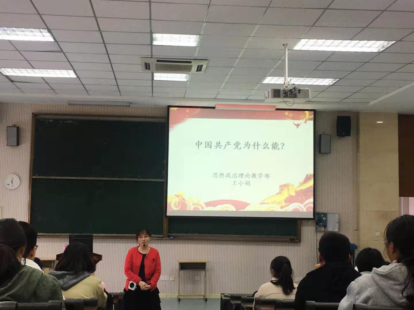 思政部指导教师王小娟以“中国共产党为什么能”为主题,为青马社做理论学习辅导讲座。她结合自己的入党经历分享了入党初心。中国共产党的初心和使命,就是为中国人民谋幸福,为中华民族谋复兴。王小娟又分别从中国共产党坚持远大理想追求、坚持科学理论引领、坚持全心全意为人民服务、有选贤任能的科学机制、有严明纪律规矩、有勇于自我革命的鲜明品格几个面论证了“中国共产党为什么能”。中国共产党就是全心全意为人民服务的马克思主义政党,正是在党的坚强领导下,中国才取得了举世瞩目的辉煌成就。青年兴则国家兴,青年强则国家强。青年一代有理想、有担当,国家就有前途,民族就有希望。