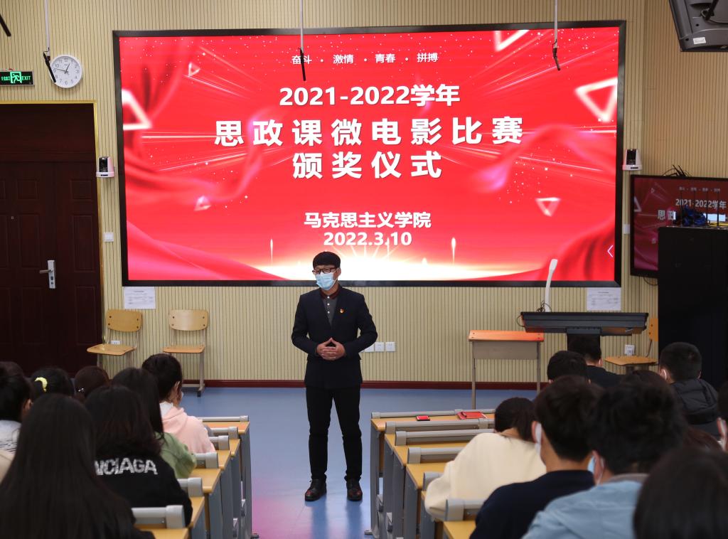 为引导大学生发现和展示身边的青春正能量,提升思政课实效性,近日,马克思主义学院组织了思政课微电影大赛,3月10日中午,大赛颁奖仪式在1号教学楼第三阶梯教室举行。宣传统战部部长、马克思主义学院党总支书记武传伟、马克思主义学院院长季洪辉、副院长伊珊,全体思政课教师及获奖学生参加了活动。