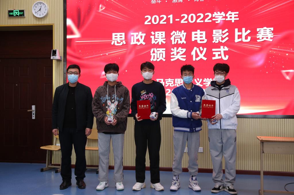仪式上,马克思主义学院教师李积龙宣读了2021-2022学年思政课微电影大赛获奖名单,老师们为获奖团队颁发了证书和奖品。随后,学生代表丁羽环、王效正发表了获奖感言。