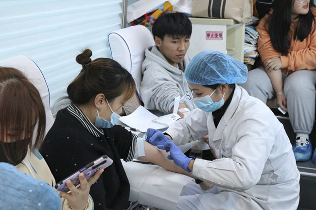 活动现场共分为登记区、体检区、献血区、休息区、领证区五大区域,有近五十名志愿者轮班为前来献血的同学们提供服务和帮助。深秋的寒冷并未阻挡同学们的献血热情。中午12:50分,同学们有序排起长队,依次进行信息登记、血液类型检验、静脉采血等环节。等待献血期间,同学们紧张而兴奋,为自己的行动能帮助他人、挽救更多的生命而感到高兴。在献血区,前来献血的同学们纷纷挽起袖管,躺在采血椅上,献出自己的青春热血,志愿者们及时上前搀扶,递上一杯温暖的糖水,在秋日中送去一份温情。在长达6个小时的献血活动中,同学们积极参与,秩序井然;志愿者们思虑周到、热情满满。