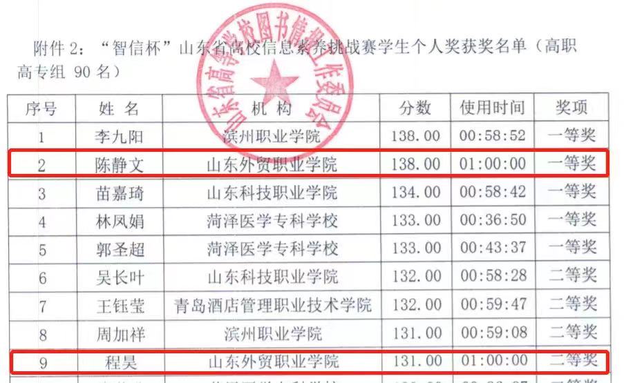6月24日 ,“智信杯”山东省高校信息素养挑战赛决赛圆满闭幕,伟德2020级国际贸易系学生陈静文以全省第二名的成绩斩获大赛一等奖, 2021级信息工程系学生程昊以全省第九名的成绩斩获大赛二等奖。